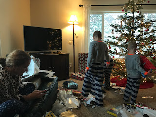Zane decorated a magnet at school that he was thrilled to give us in a personally decorated bag. The boys got OSU shirts from Nana and Papa that Grandpa would love. I think I might regret getting Zane such a humongous plane, although he is thrilled. And Lucy found some presents to be very handy in front of the fire.